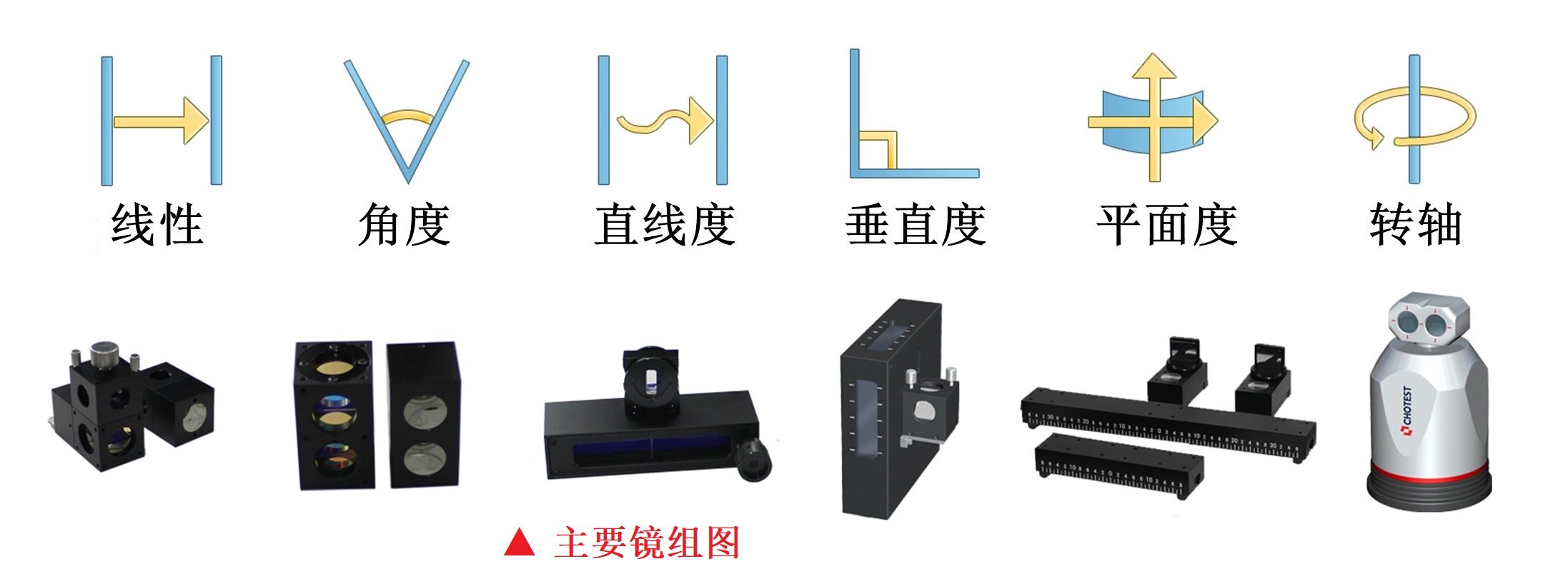 SJ6000激光干涉仪系统具有丰富的模块化组件,可根据具体测量需求而选择不同的组件。主要镜组如下图所列,依次为线性镜组、角度镜组、直线度镜组、垂直度镜组、平面度镜组、自动精密转台。